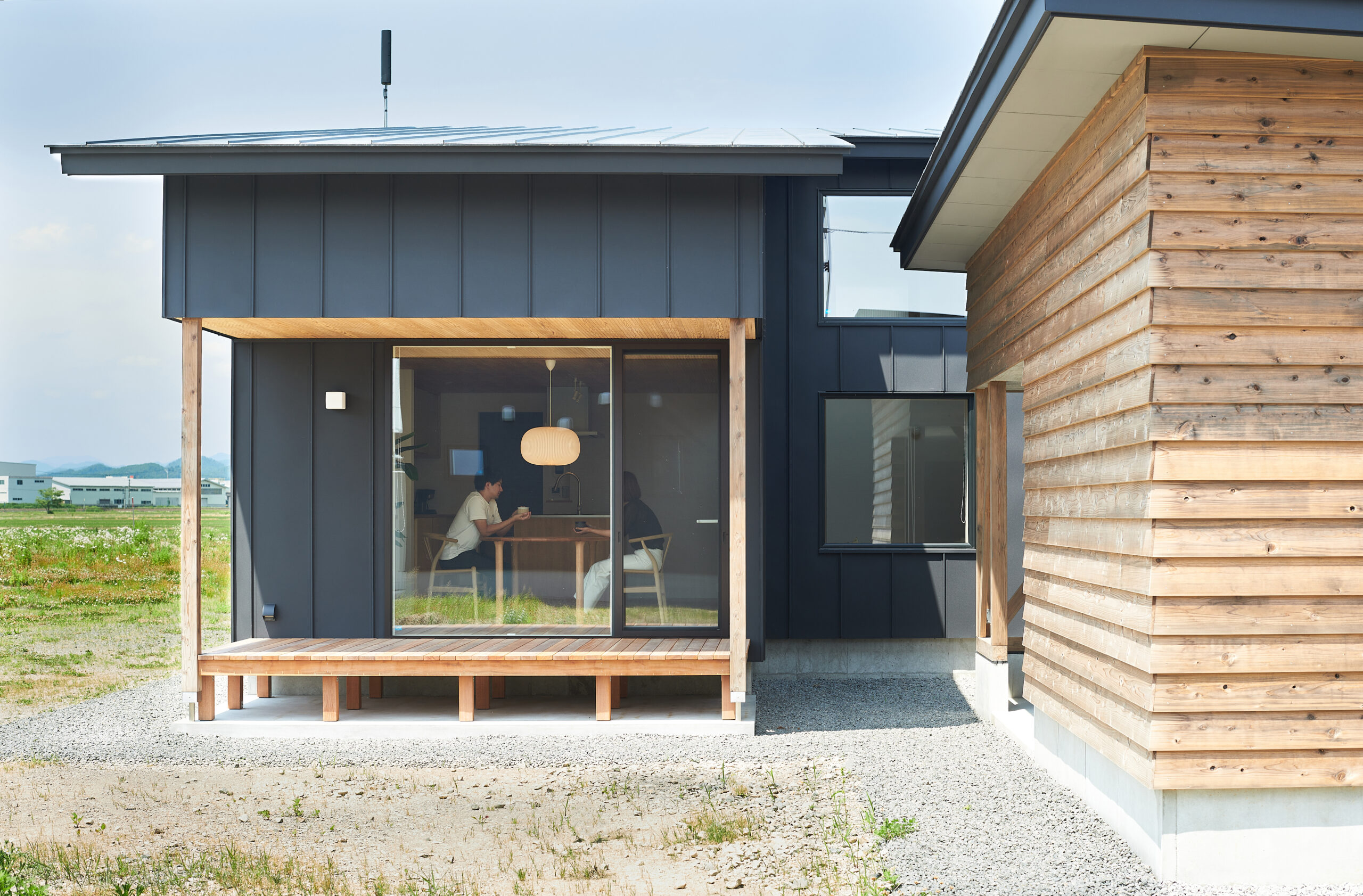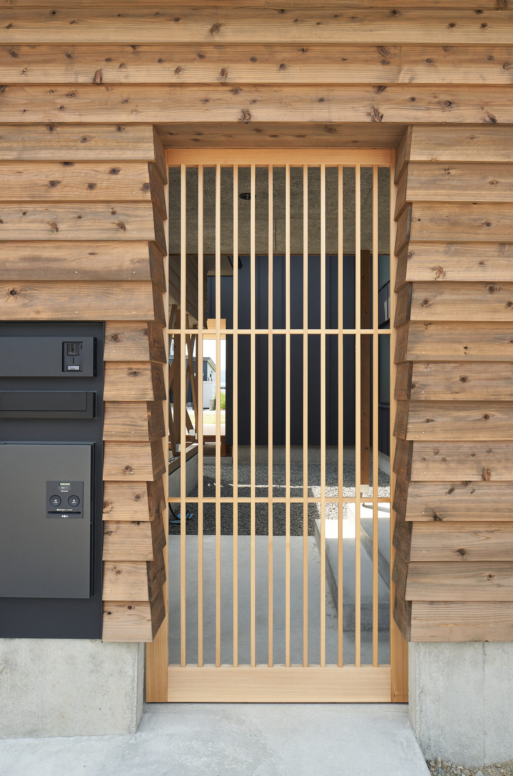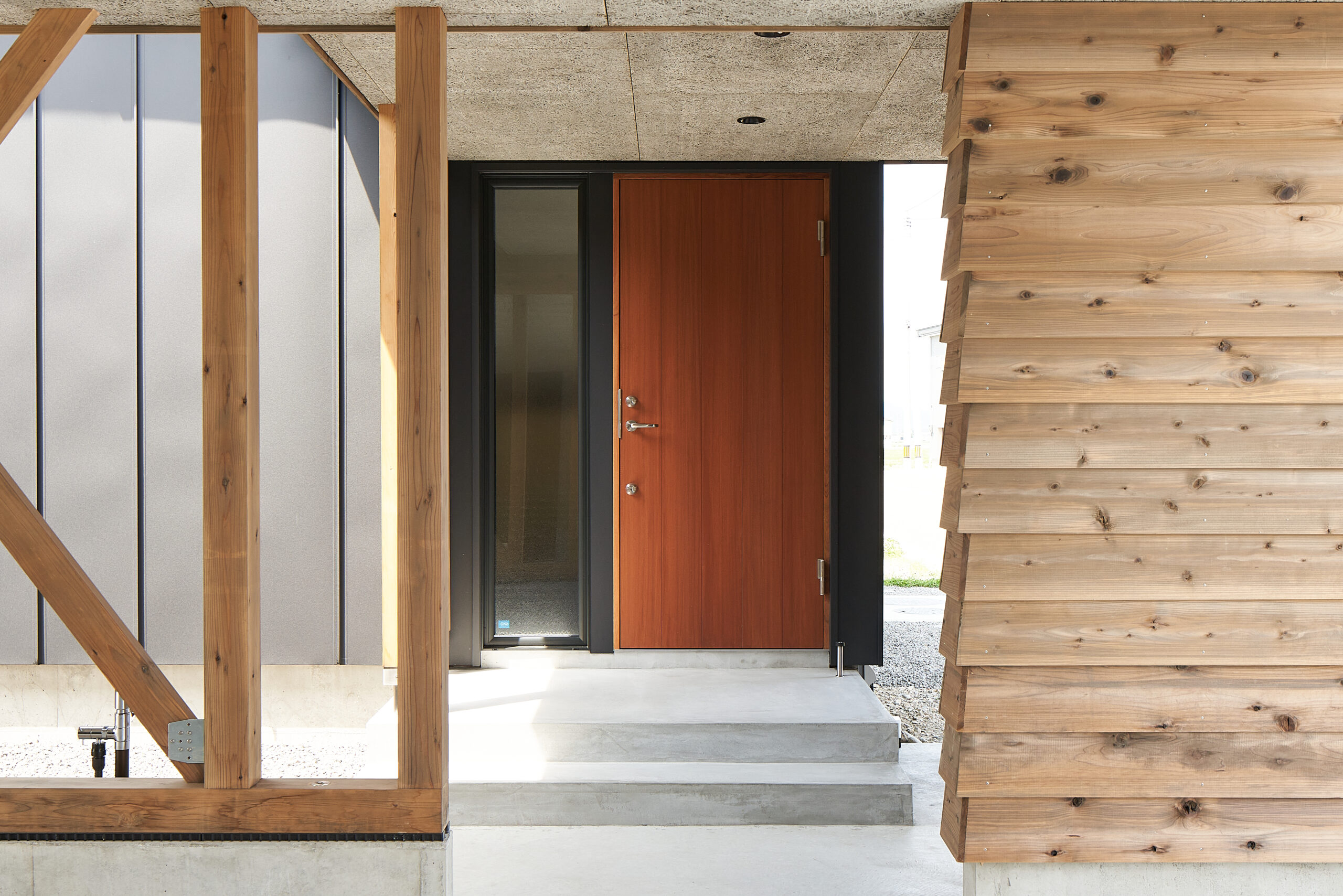 壁/ガルバリウム鋼板 縦ハゼ張り / 秋田杉鎧張り ウッドロングエコ仕上げ(ガレージ部)